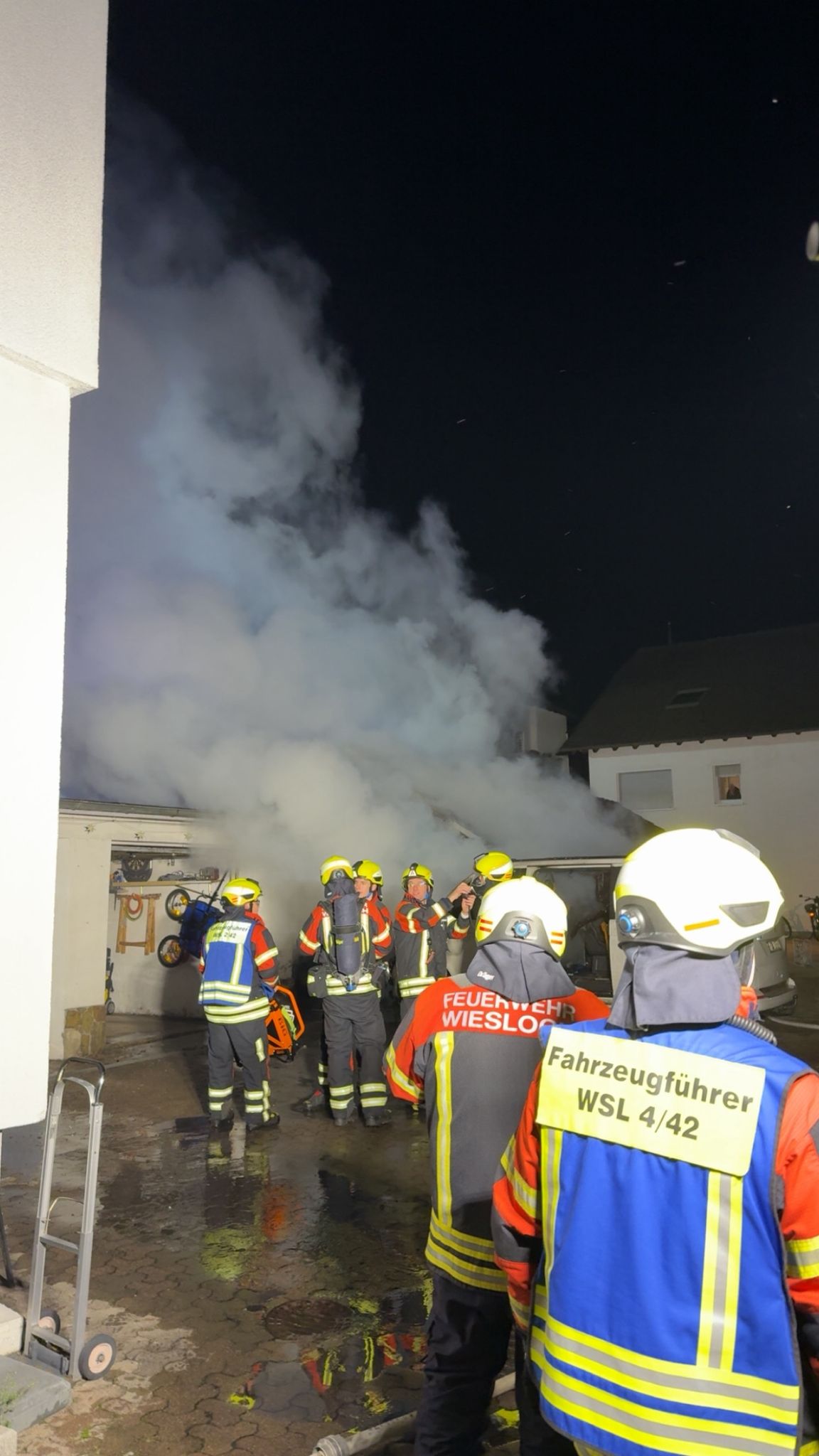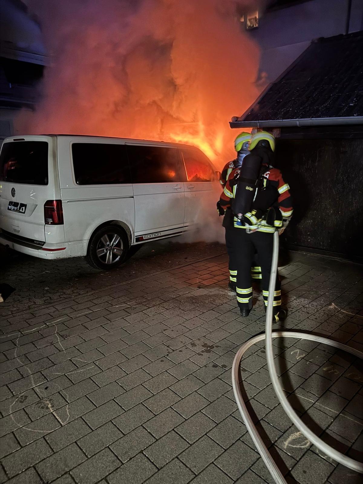 An der Einsatzstelle angekommen, erwartete die Einsatzkräfte heller Flammenschein: Eine Garage und ein halb darin geparkter Kleinbus standen in Flammen. Durch Risse in der Garage schlugen Flammen gefährlich in Richtung eines dahinter befindlichen Gebäudes. Zwei Trupps unter Atemschutz