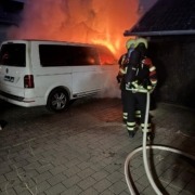 An der Einsatzstelle angekommen, erwartete die Einsatzkräfte heller Flammenschein: Eine Garage und ein halb darin geparkter Kleinbus standen in Flammen. Durch Risse in der Garage schlugen Flammen gefährlich in Richtung eines dahinter befindlichen Gebäudes. Zwei Trupps unter Atemschutz